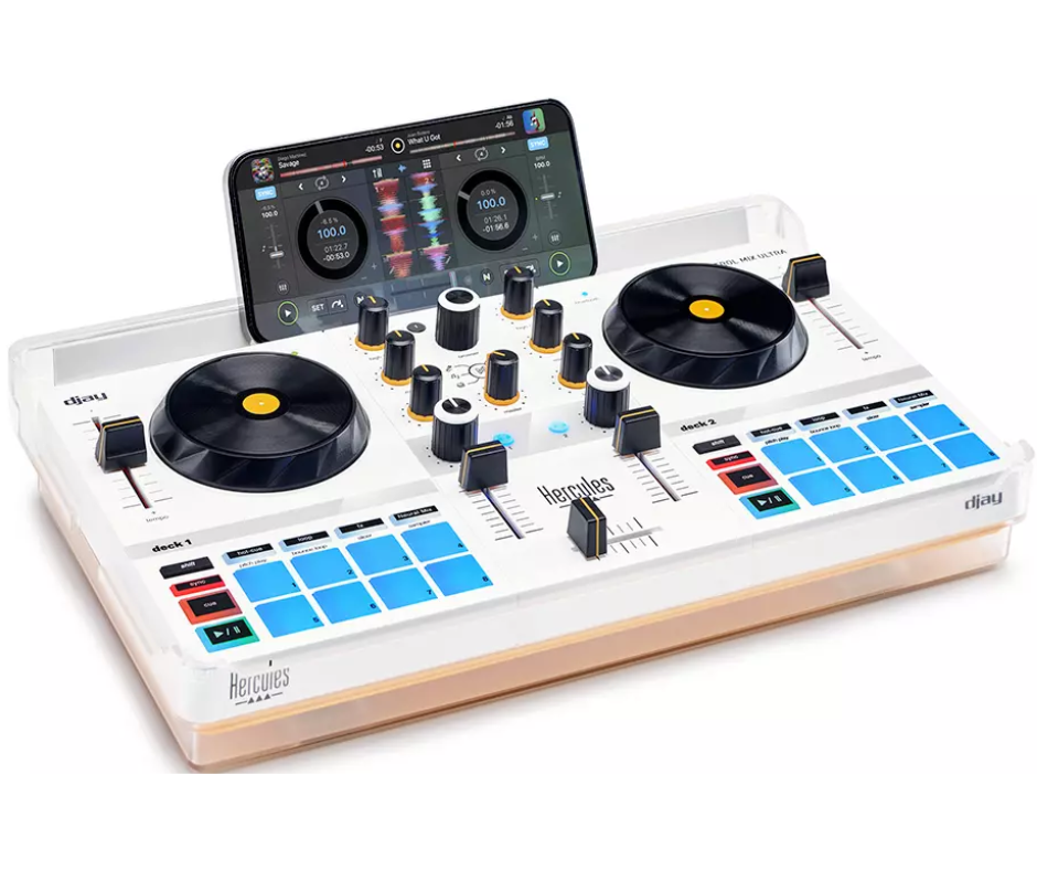 Hercules DJControl Mix Ultra is a mobile, battery-powered DJ controller designed for smartphones and tablets. It offers full DJ control via Bluetooth, touch-sensitive jog wheels, and streaming integration through the included djay app, making it ideal for mixing anytime, anywhere.